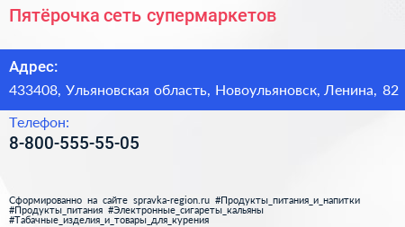 Пятёрочка, сеть супермаркетов по адресу 433408, Ульяновская область, Новоульяновск, Ленина, 82 в дальнейшем Организация, размещена в следующих категориях: