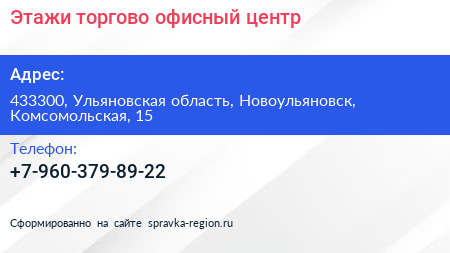 Этажи, торгово-офисный центр по адресу 433300, Ульяновская область, Новоульяновск, Комсомольская, 15 в дальнейшем Организация, размещена в следующих категориях: