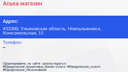 Аська, магазин по адресу 433300, Ульяновская область, Новоульяновск, Комсомольская, 15 в дальнейшем Организация, размещена в следующих категориях: