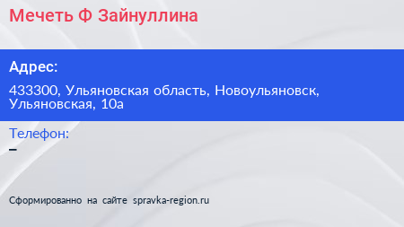 Мечеть Ф. Зайнуллина по адресу 433300, Ульяновская область, Новоульяновск, Ульяновская, 10а в дальнейшем Организация, размещена в следующих категориях:
