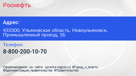 Роснефть по адресу 433300, Ульяновская область, Новоульяновск, Промышленный проезд, 1Б в дальнейшем Организация, размещена в следующих категориях: