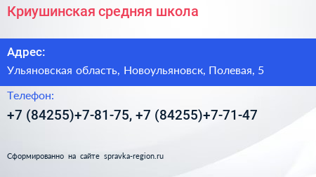 Криушинская средняя школа по адресу Ульяновская область, Новоульяновск, Полевая, 5 в дальнейшем Организация, размещена в следующих категориях:
