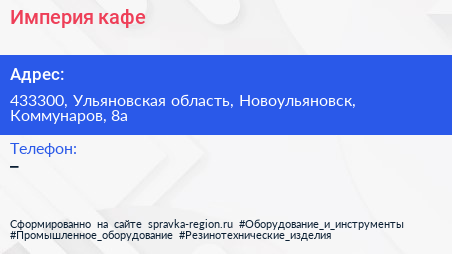 Империя, кафе по адресу 433300, Ульяновская область, Новоульяновск, Коммунаров, 8а в дальнейшем Организация, размещена в следующих категориях: