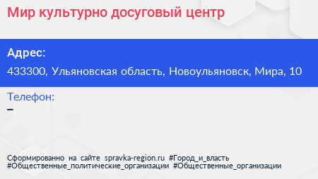 Мир, культурно-досуговый центр по адресу 433300, Ульяновская область, Новоульяновск, Мира, 10 в дальнейшем Организация, размещена в следующих категориях: