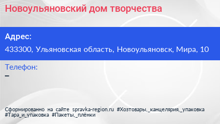 Новоульяновский дом творчества по адресу 433300, Ульяновская область, Новоульяновск, Мира, 10 в дальнейшем Организация, размещена в следующих категориях: