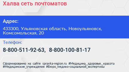 Халва, сеть почтоматов по адресу 433300, Ульяновская область, Новоульяновск, Комсомольская, 20 в дальнейшем Организация, размещена в следующих категориях: