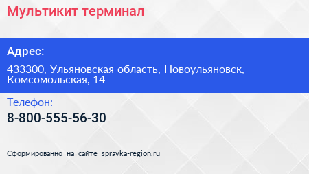Мультикит, терминал по адресу 433300, Ульяновская область, Новоульяновск, Комсомольская, 14 в дальнейшем Организация, размещена в следующих категориях: