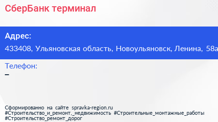 СберБанк, терминал по адресу 433408, Ульяновская область, Новоульяновск, Ленина, 58а в дальнейшем Организация, размещена в следующих категориях: