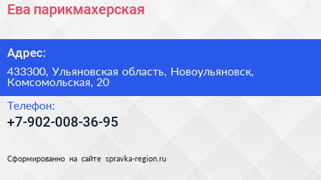 Ева, парикмахерская по адресу 433300, Ульяновская область, Новоульяновск, Комсомольская, 20 в дальнейшем Организация, размещена в следующих категориях: