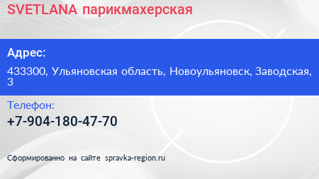 SVETLANA, парикмахерская по адресу 433300, Ульяновская область, Новоульяновск, Заводская, 3 в дальнейшем Организация, размещена в следующих категориях: