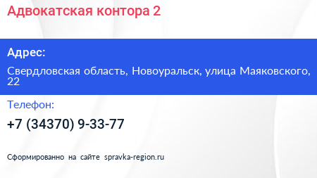 Адвокатская контора №2 по адресу Свердловская область, Новоуральск, улица Маяковского, 22 в дальнейшем Организация, размещена в следующих категориях: