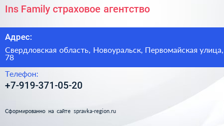 Ins Family, страховое агентство по адресу Свердловская область, Новоуральск, Первомайская улица, 78 в дальнейшем Организация, размещена в следующих категориях: