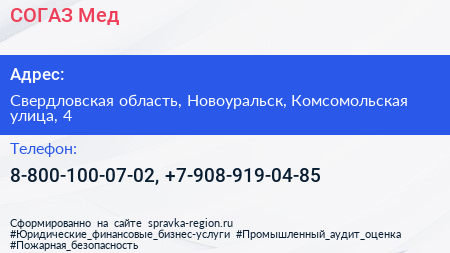 СОГАЗ-Мед по адресу Свердловская область, Новоуральск, Комсомольская улица, 4 в дальнейшем Организация, размещена в следующих категориях: