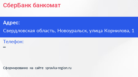 СберБанк, банкомат по адресу Свердловская область, Новоуральск, улица Корнилова, 1 в дальнейшем Организация, размещена в следующих категориях: