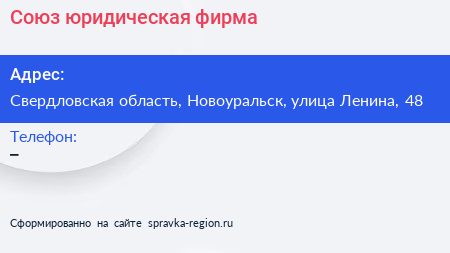 Союз, юридическая фирма по адресу Свердловская область, Новоуральск, улица Ленина, 48 в дальнейшем Организация, размещена в следующих категориях: