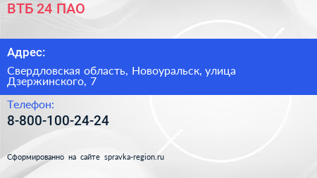 ВТБ 24, ПАО по адресу Свердловская область, Новоуральск, улица Дзержинского, 7 в дальнейшем Организация, размещена в следующих категориях: