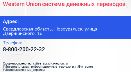 Western Union, система денежных переводов по адресу Свердловская область, Новоуральск, улица Дзержинского, 16 в дальнейшем Организация, размещена в следующих категориях: