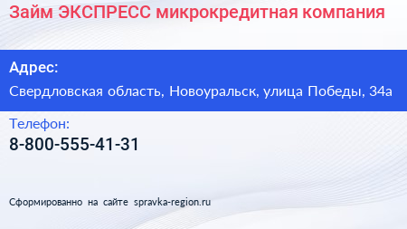 Займ ЭКСПРЕСС, микрокредитная компания по адресу Свердловская область, Новоуральск, улица Победы, 34а в дальнейшем Организация, размещена в следующих категориях: