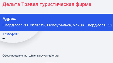 Дельта-Трэвел, туристическая фирма по адресу Свердловская область, Новоуральск, улица Свердлова, 12 в дальнейшем Организация, размещена в следующих категориях: