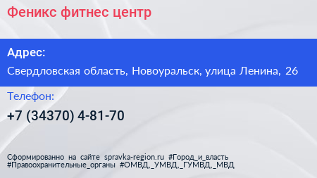 Феникс, фитнес-центр по адресу Свердловская область, Новоуральск, улица Ленина, 26 в дальнейшем Организация, размещена в следующих категориях: