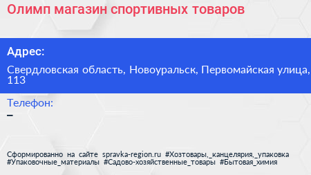 Олимп, магазин спортивных товаров по адресу Свердловская область, Новоуральск, Первомайская улица, 113 в дальнейшем Организация, размещена в следующих категориях:
