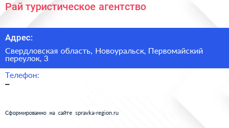 Рай, туристическое агентство по адресу Свердловская область, Новоуральск, Первомайский переулок, 3 в дальнейшем Организация, размещена в следующих категориях: