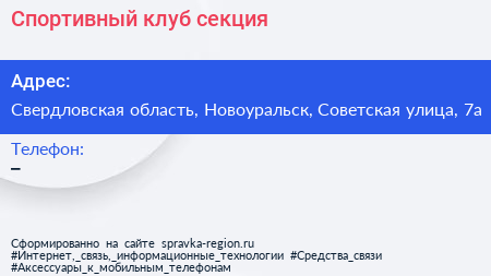 Спортивный клуб, секция по адресу Свердловская область, Новоуральск, Советская улица, 7а в дальнейшем Организация, размещена в следующих категориях:
