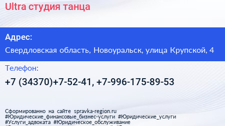 Ultra, студия танца по адресу Свердловская область, Новоуральск, улица Крупской, 4 в дальнейшем Организация, размещена в следующих категориях:
