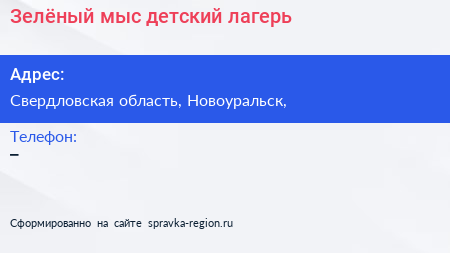 Зелёный мыс, детский лагерь по адресу Свердловская область, Новоуральск, в дальнейшем Организация, размещена в следующих категориях: