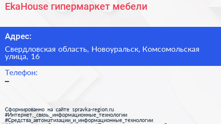 EkaHouse, гипермаркет мебели по адресу Свердловская область, Новоуральск, Комсомольская улица, 16 в дальнейшем Организация, размещена в следующих категориях: