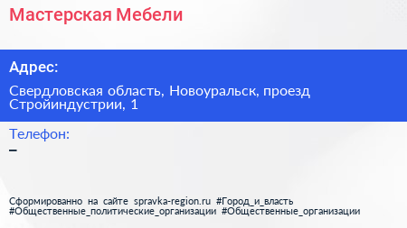 Мастерская Мебели по адресу Свердловская область, Новоуральск, проезд Стройиндустрии, 1 в дальнейшем Организация, размещена в следующих категориях: