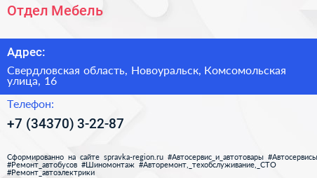Отдел Мебель по адресу Свердловская область, Новоуральск, Комсомольская улица, 16 в дальнейшем Организация, размещена в следующих категориях: