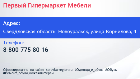 Первый Гипермаркет Мебели по адресу Свердловская область, Новоуральск, улица Корнилова, 4 в дальнейшем Организация, размещена в следующих категориях: