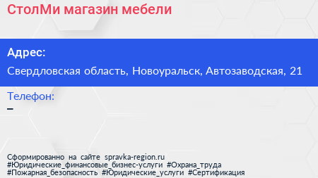 СтолМи, магазин мебели по адресу Свердловская область, Новоуральск, Автозаводская, 21 в дальнейшем Организация, размещена в следующих категориях: