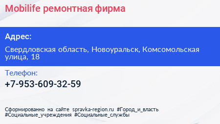 Mobilife, ремонтная фирма по адресу Свердловская область, Новоуральск, Комсомольская улица, 18 в дальнейшем Организация, размещена в следующих категориях:
