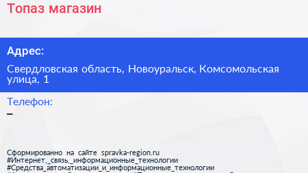 Топаз, магазин по адресу Свердловская область, Новоуральск, Комсомольская улица, 1 в дальнейшем Организация, размещена в следующих категориях: