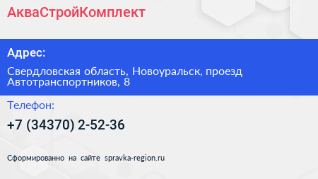 АкваСтройКомплект по адресу Свердловская область, Новоуральск, проезд Автотранспортников, 8 в дальнейшем Организация, размещена в следующих категориях: