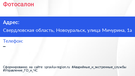 Фотосалон по адресу Свердловская область, Новоуральск, улица Мичурина, 1а в дальнейшем Организация, размещена в следующих категориях: