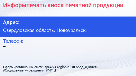 Информпечать, киоск печатной продукции по адресу Свердловская область, Новоуральск, в дальнейшем Организация, размещена в следующих категориях: