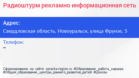 Радиоштурм, рекламно-информационная сеть по адресу Свердловская область, Новоуральск, улица Фрунзе, 5 в дальнейшем Организация, размещена в следующих категориях:
