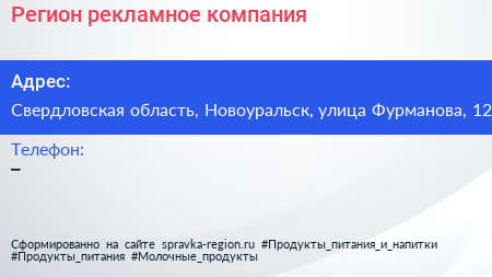 Регион, рекламное компания по адресу Свердловская область, Новоуральск, улица Фурманова, 12 в дальнейшем Организация, размещена в следующих категориях: