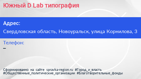 Южный D-Lab, типография по адресу Свердловская область, Новоуральск, улица Корнилова, 3 в дальнейшем Организация, размещена в следующих категориях: