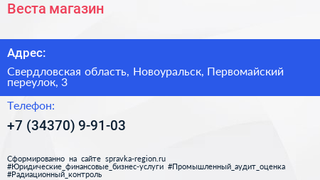 Веста, магазин по адресу Свердловская область, Новоуральск, Первомайский переулок, 3 в дальнейшем Организация, размещена в следующих категориях: