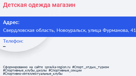 Детская одежда, магазин по адресу Свердловская область, Новоуральск, улица Фурманова, 41 в дальнейшем Организация, размещена в следующих категориях: