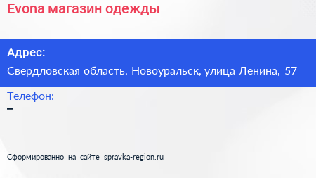 Evona, магазин одежды по адресу Свердловская область, Новоуральск, улица Ленина, 57 в дальнейшем Организация, размещена в следующих категориях: