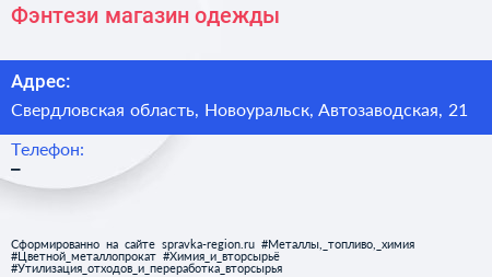 Фэнтези, магазин одежды по адресу Свердловская область, Новоуральск, Автозаводская, 21 в дальнейшем Организация, размещена в следующих категориях: