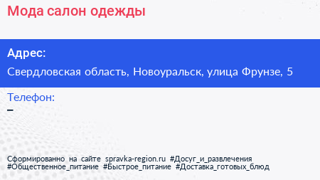 Мода, салон одежды по адресу Свердловская область, Новоуральск, улица Фрунзе, 5 в дальнейшем Организация, размещена в следующих категориях: