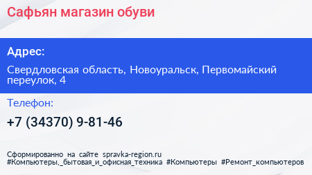 Сафьян, магазин обуви по адресу Свердловская область, Новоуральск, Первомайский переулок, 4 в дальнейшем Организация, размещена в следующих категориях: