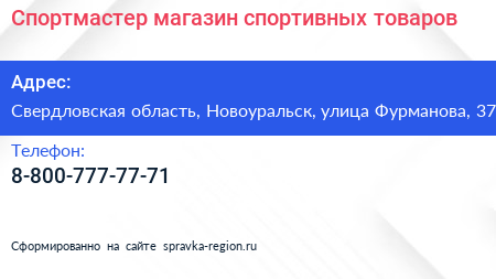 Спортмастер, магазин спортивных товаров по адресу Свердловская область, Новоуральск, улица Фурманова, 37 в дальнейшем Организация, размещена в следующих категориях: