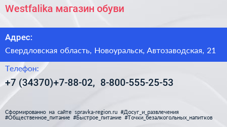 Westfalika, магазин обуви по адресу Свердловская область, Новоуральск, Автозаводская, 21 в дальнейшем Организация, размещена в следующих категориях: